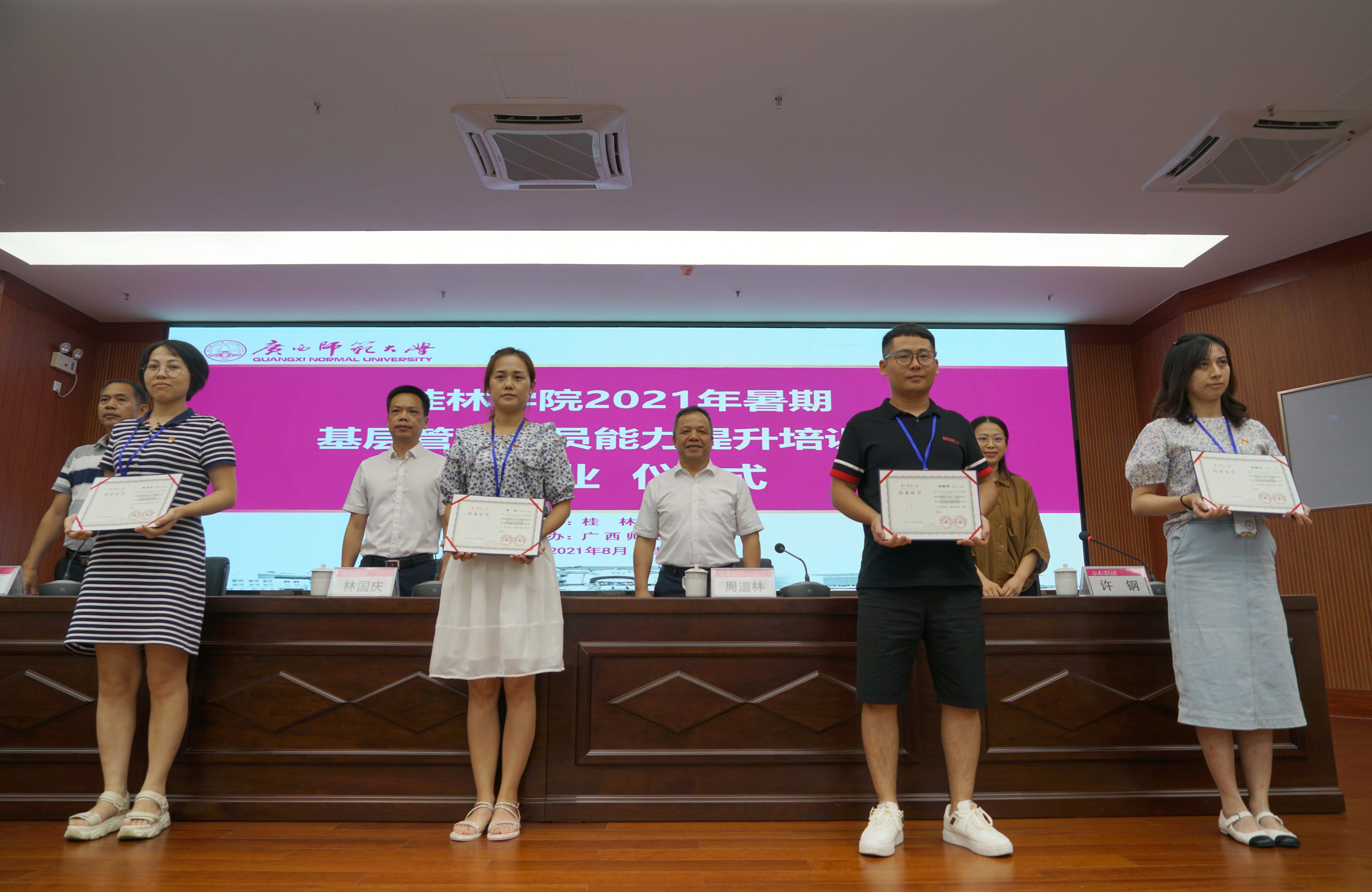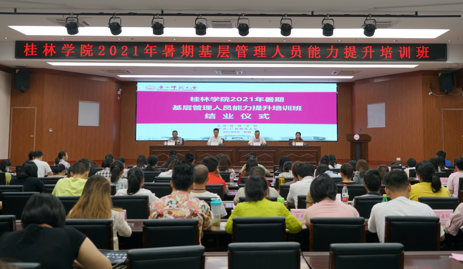 8月2日下午,桂林學(xué)院基層管理人員能力提升培訓(xùn)班結(jié)業(yè)儀式在廣西師范大學(xué)育才校區(qū)國際教育交流中心報告廳舉行,共有來自桂林學(xué)院的98名基層管理人員參加了這次為期三天的培訓(xùn)。廣西師范大學(xué)黨委常委、組織部部長林國慶,桂林新城投資集團(tuán)黨總支書記、董事長、總經(jīng)理、桂林學(xué)院董事長周道林,桂林學(xué)院校長楊樹喆等出席結(jié)業(yè)儀式。廣西師范大學(xué)干部教育培訓(xùn)學(xué)院辦公室主任許鋼主持結(jié)業(yè)儀式。