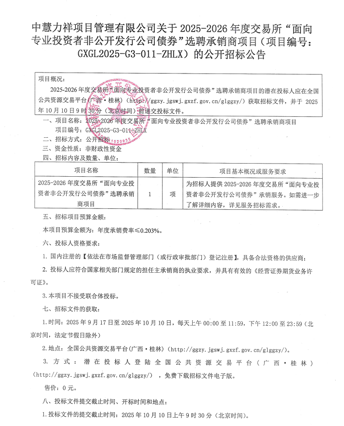 中慧力祥項目管理有限公司關(guān)于2025-2026年度交易所“面向?qū)I(yè)投資者非公開發(fā)行公司債券”選聘承銷商項目(項目編號:GXGL2025-G3-011-ZHLX)的公開招標(biāo)公告