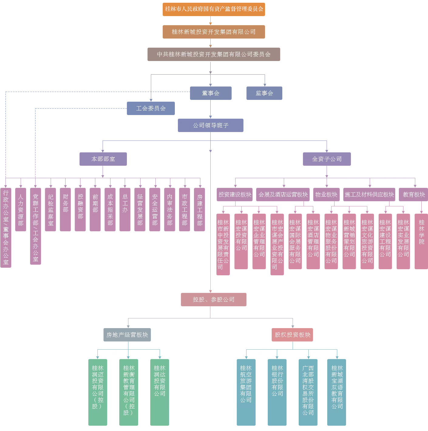公司下設(shè)12個(gè)全資子公司,分為五大板塊,其中(一)投資建設(shè)板塊:桂林市新中投資發(fā)展有限責(zé)任公司、桂林宏謀投資有限公司、桂林宏謀企業(yè)管理有限公司、桂林市宏謀會(huì)展產(chǎn)業(yè)投資有限公司;(二)會(huì)展及酒店運(yùn)營(yíng)板塊:桂林宏謀國(guó)際會(huì)展服務(wù)有限公司、桂林宏謀酒店管理有限公司;(三)物業(yè)板塊:桂林宏謀物業(yè)服務(wù)股份有限公司、桂林新城營(yíng)銷(xiāo)策劃有限公司、桂林宏謀文化旅游投資有限公司;(四)施工及材料供應(yīng)板塊:桂林宏謀建設(shè)工程有限公司、桂林宏謀實(shí)業(yè)發(fā)展有限公司;(五)教育板塊:桂林學(xué)院。