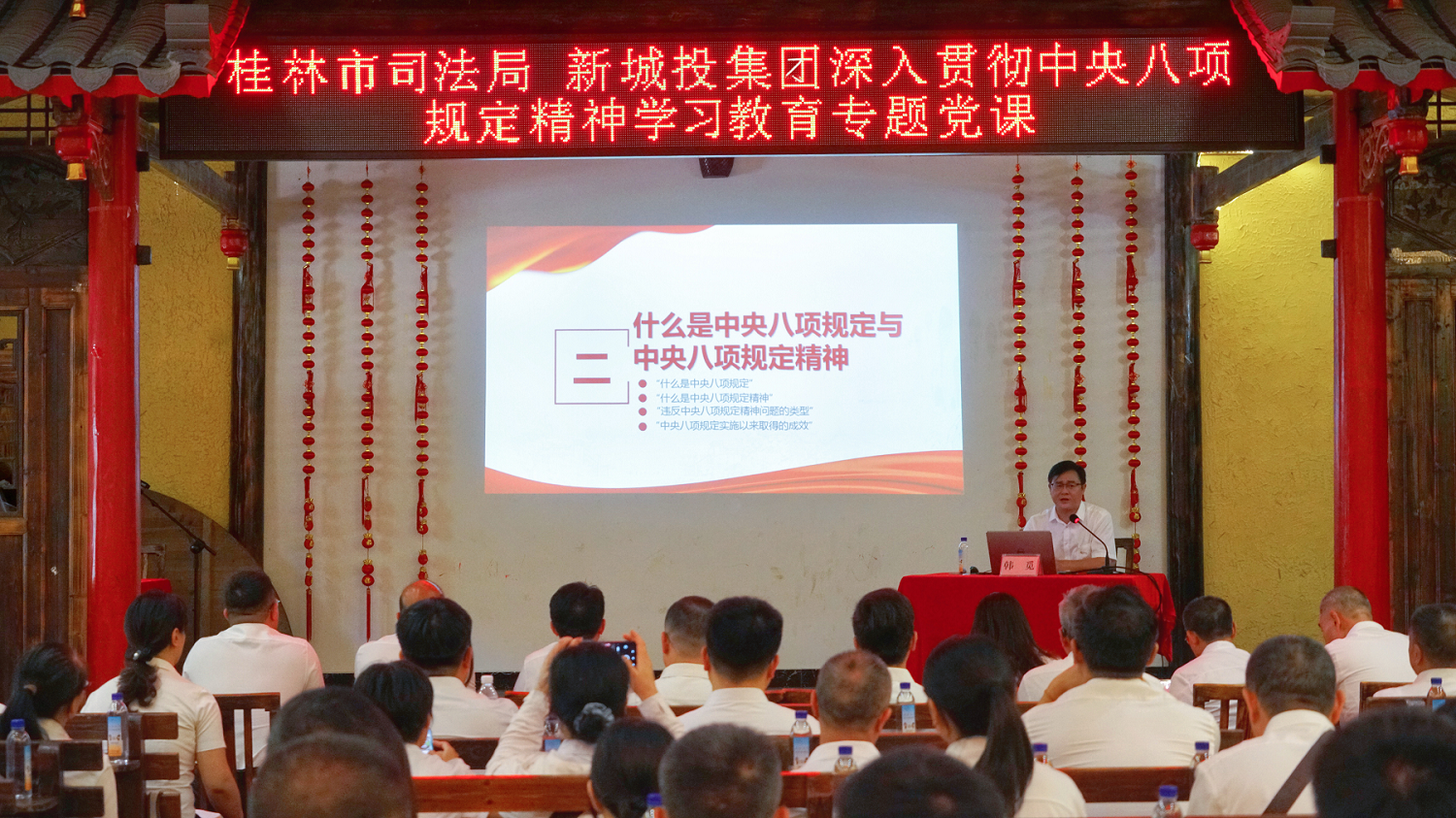 隨后,韓覓同志為全體人員講授了一堂專題黨課。以“深學(xué)篤行習(xí)近平總書記關(guān)于加強黨的作風(fēng)建設(shè)的重要論述 持續(xù)擦亮中央八項規(guī)定‘金色名片’以作風(fēng)建設(shè)新成效推動司法行政工作和國有企業(yè)內(nèi)控高質(zhì)量發(fā)展”為題,圍繞“為什么要強調(diào)作風(fēng)建設(shè),什么是中央八項規(guī)定與中央八項規(guī)定精神,如何開展好深入貫徹中央八項規(guī)定精神學(xué)習(xí)教育”三個方面,重點闡述了“為什么、是什么、怎么做”,進(jìn)一步增強了黨員干部紀(jì)律意識和規(guī)矩意識,對切實改進(jìn)工作作風(fēng)具有很強的指導(dǎo)意義。